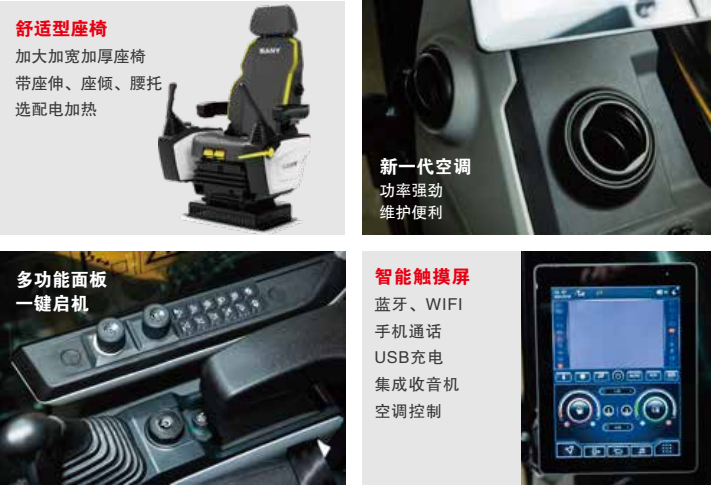 全新智能驾驶室,数字化科技感、操作便利性、自动和安全施工等方面实现超越,在智能化、舒适性、可靠性等方面的性能得到大幅提升,整体设计简约、现代、高品质,为用户在视觉、触觉、心理感受上,提供一个身心俱佳的环境。