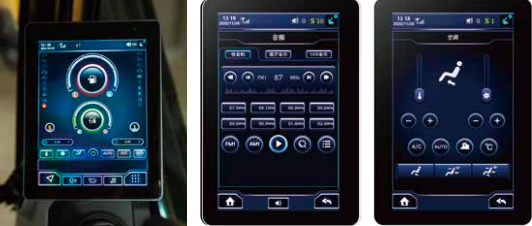 多功能操作界面:车况信息界面帮客户直观了解车辆状态 、多媒体界面配置收音机蓝牙USB音乐等娱乐功能、空调界面可精准调节冷暖温度和风速。