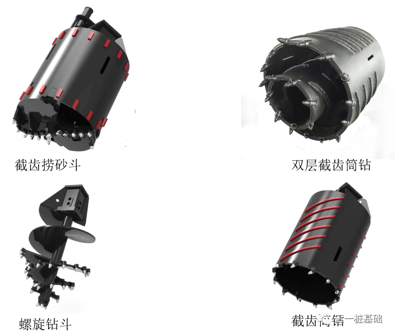 针对粒径的不同选择不同的钻具,小颗粒(<200mm):可直接采用捞砂斗钻进;中等以上颗粒(200-800mm):可直接采用双层嵌岩筒钻进行取土(桩径设计外筒直径,卵石粒径设计内筒直径,内筒比外筒高),或采用螺旋斗带出松动,后单层或双层嵌岩筒钻配合钻进;大粒径(800mm):可用螺旋松动后带出,或使用嵌岩筒钻带出,筒钻内增加钢丝绳或楔断器,利于大岩块被钻筒内壁卡紧。