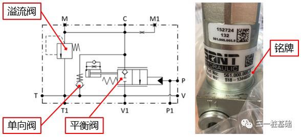 SR235及以上机型变幅、桅杆平衡阀为同一款阀,阀组中包括平衡阀、溢流阀和单向阀,铭牌为561.000.005.9。