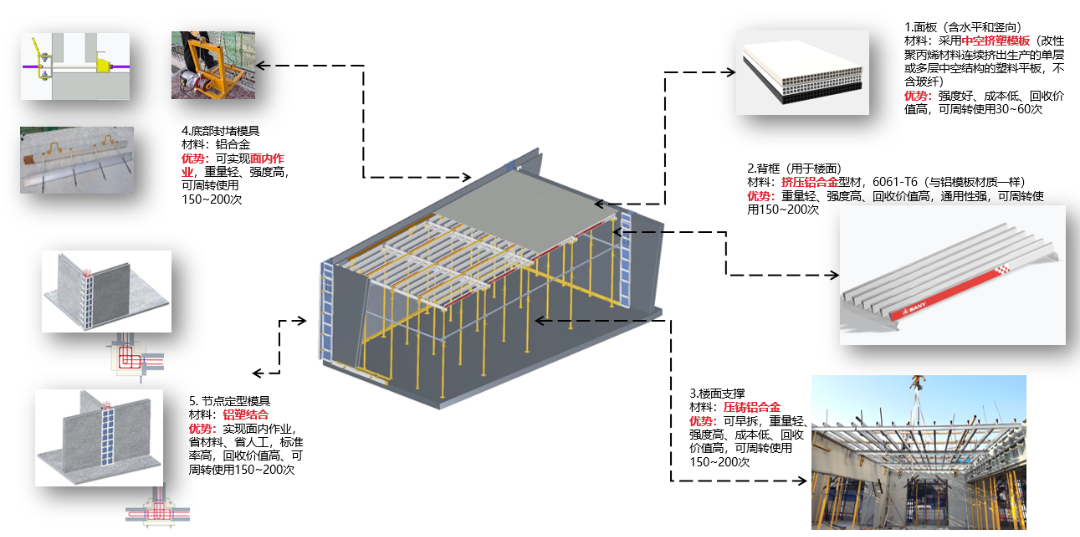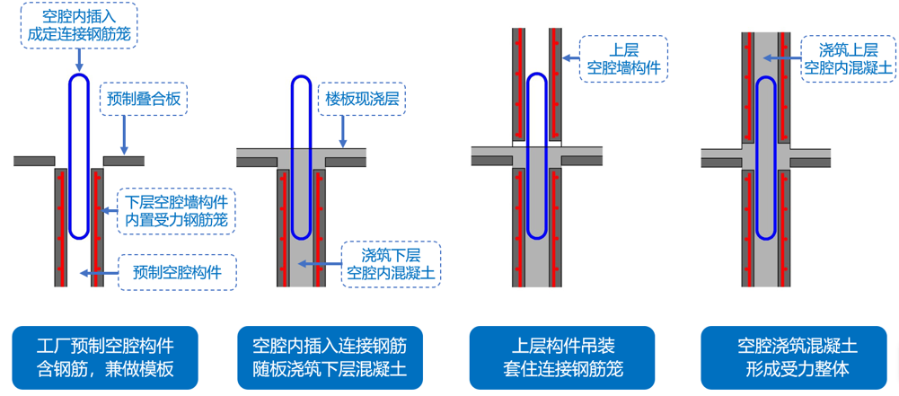 在SPCS技术路线中,基于“多面不出筋、多面全预制、中间大空腔”的“空腔墙柱”(见图1),采用受力性能等同现浇结构的“等效异构”连接方式(见图2),进行组合,实现了现场少拼缝、少支模、少绑扎的施工作业效果,显著减少人工,提高工期,保证结构整体安全不漏水。在结构现浇位置,利用“工模技术”(见图3),实现了模具安拆便捷、省人提效,结构成型效果好等优势;再加之“面内作业”施工工法(见图4),取消了传统外脚手架,所有施工过程在结构面内完成,节省了搭拆外架的工序和成本,更是在根本上杜绝了借助外架施工带来的高空坠落事故。