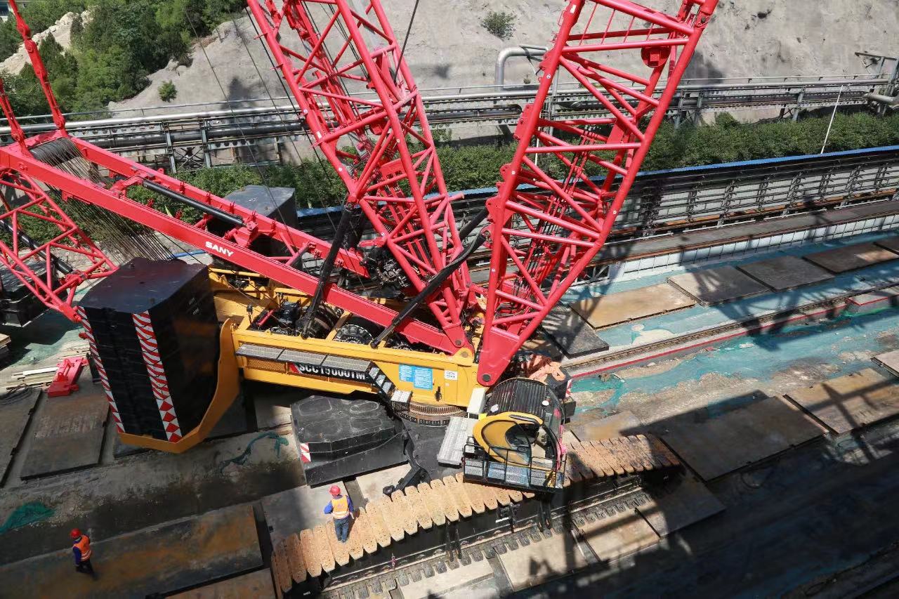 5月7日上午9时,吊装正式开始。SCC15000TM和SCC17000TM合力将重量440吨、长度120米的主桁架抬起绕过滑线,到达机侧推焦机轨道间上空,再带载行走,调整吊装姿态,稳定桁架。随后,SCC15000TM将配重增加至370吨,与SCC17000TM一起将桁架抬吊至炉顶的门型支架上,实现就位,完成吊装。