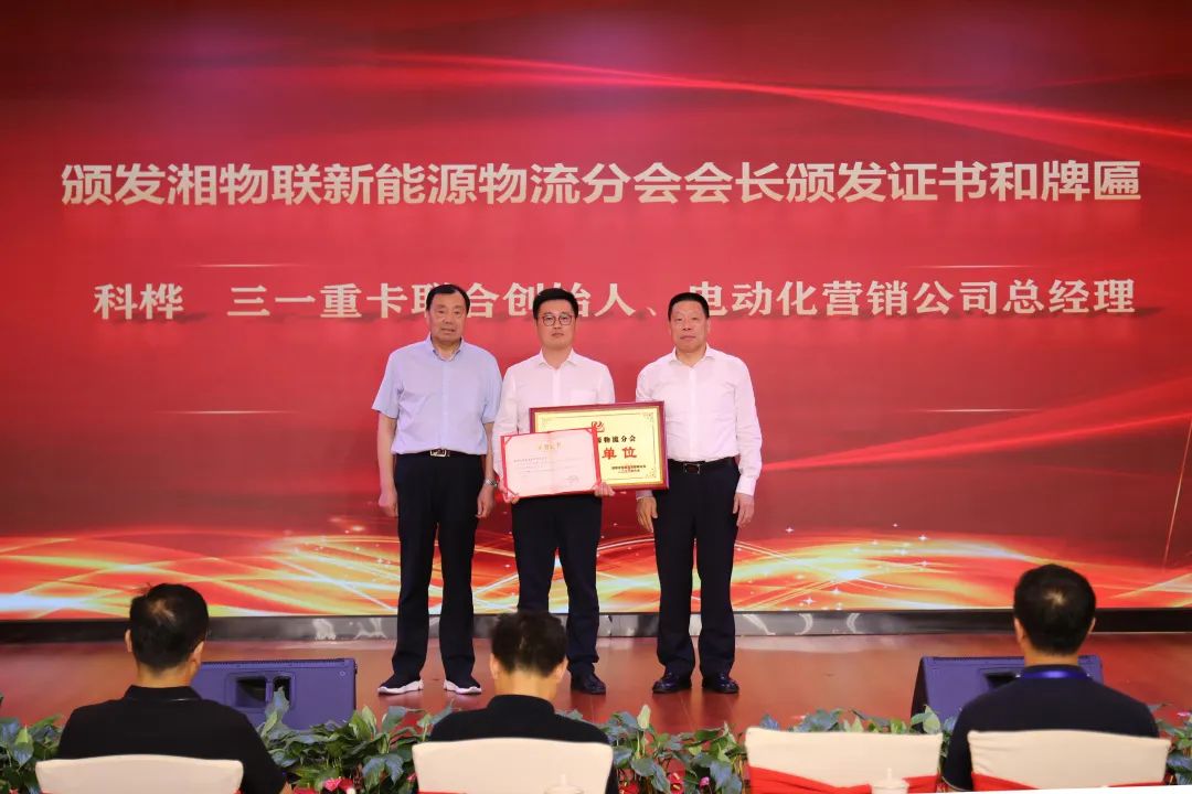 湖南省物流与采购联合会会长尹国杰(右),湖南省物流与采购联合会书记刘平(左)为湘物联绿色新能源物流分会会长科桦颁发证书牌匾