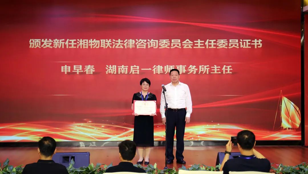 湖南省物流与采购联合会会长尹国杰(右)为湘物联法律咨询委员会主任委员申早春(左)颁发证书