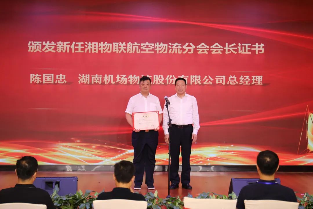 湖南省物流与采购联合会会长尹国杰(右)为湘物联航空物流分会会长陈国忠(左)颁发证书