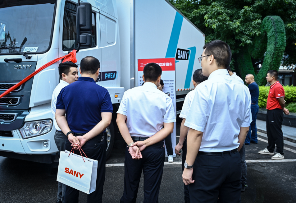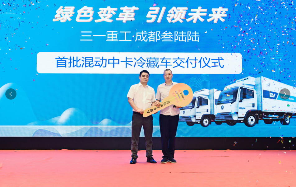 致辞环节后,好体育投注网站重工·成都叁陆陆举行了“首批混动中卡冷藏车交付仪式”,好体育投注网站重工代表将象征着“精诚合作”的冷藏车金钥匙交付给成都叁陆陆代表,这意味着冷藏车正式交付客户使用,也代表着双方正式携手合作,共同为绿色冷链运输行业贡献力量。